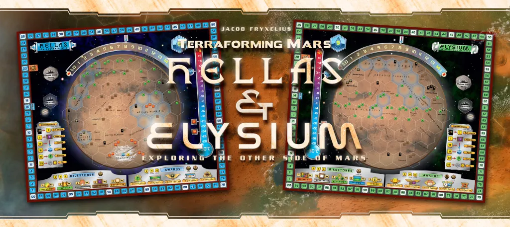 Hellas & Elysium är den första expansionen för Terraforming Mars. Den har två nya spelplaner som kan spelas istället för huvudspelets Tharsis-karta.